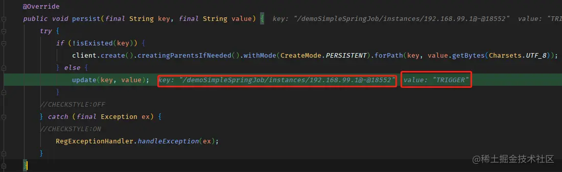 regCenter.persist方法,发现就是设置内容TRIGGER到 zookeeper 中节点/demoSimpleSpringJob/instances/192.168.99.1@-@18552上