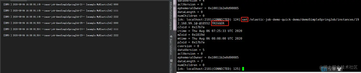 在 zookeeper 客户端内执行 set /elastic-job-demo-quick-demo/demoSimpleSpringJob/instances/192.168.99.1@-@18552 TRIGGER 效果如下,当命令输入完成,应用控制台马上输出了作业工作时的日志。