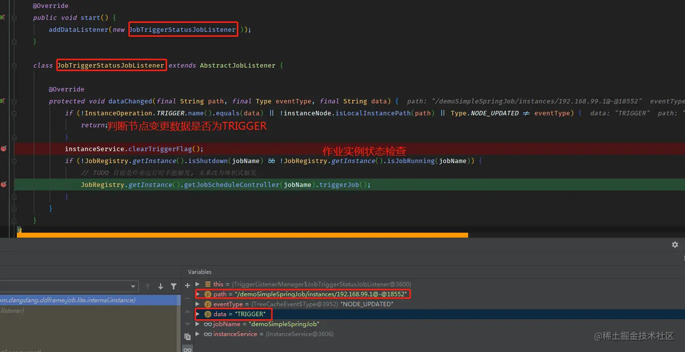 start()方法会调用作业注册中心的监听器JobTriggerStatusJobListener去检查注册中心的数据节点,判断是否有TRIGGER的数据操作