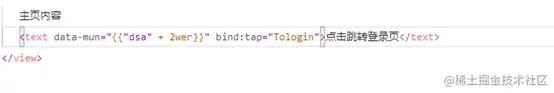 好了, 介绍完页面构成, 我们就开始写代码了, 首先在首页写一个text标签, 绑定一个tap事件, 让它可以跳转到登录页. 这里讲一下, **小程序绑定事件和方法使用的是bind, 可以看做是on, 作用类似, tap是手指触摸事件, 绑定事件有两种形式, bindtap 和bind:tap 作用都一样, 随便用哪一个, 但是需要注意的是, 绑定的事件方法名里, 是不支持形参的, 也就是说, 无论你绑定的是方法还是事件, 都没办法跟vue中一样可以直接通过形参传递你想要在方法中使用的参数. **