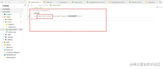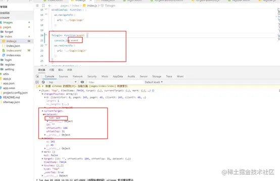 当然, 你还是可以获取到想要的参数的, 只是换了个方式, 小程序中, 如果你想往方法事件中传递参数, 可以直接在标签上写data-参数名好, 现在我传参了, 那么怎么获取呢? 我们先到.js文件中, 去创建这个Tologin方法,然后, 这个方法会有个默认形参, event, 这个参数中就包含了当前触发事件的标签的所有基本信息, 你可以在currentTarget-dataset中获取你传递的参数.所有以data前缀的参数都会被放在这里