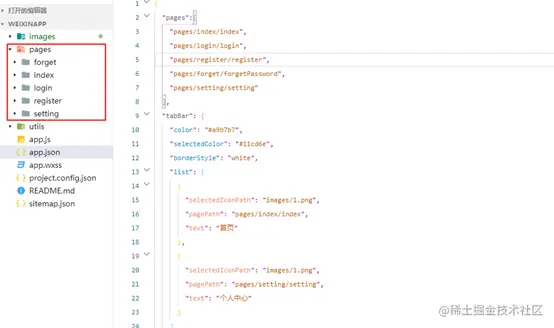这里说明一下, 使用微信开发工具时, 只要在app.json中添加引用路径, 那么, 项目pages中会自动生成对应文件夹, 同理, 删去文件夹/路径时, 也要删除对应的路径/文件夹.