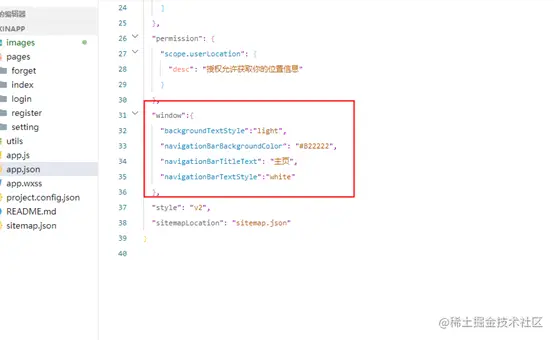 app.json: 当前项目的配置文件。包括项目的页面引入、导航条颜色、导航条标题 等等,是项目具体到代码开发上的配置。介绍几个配置: