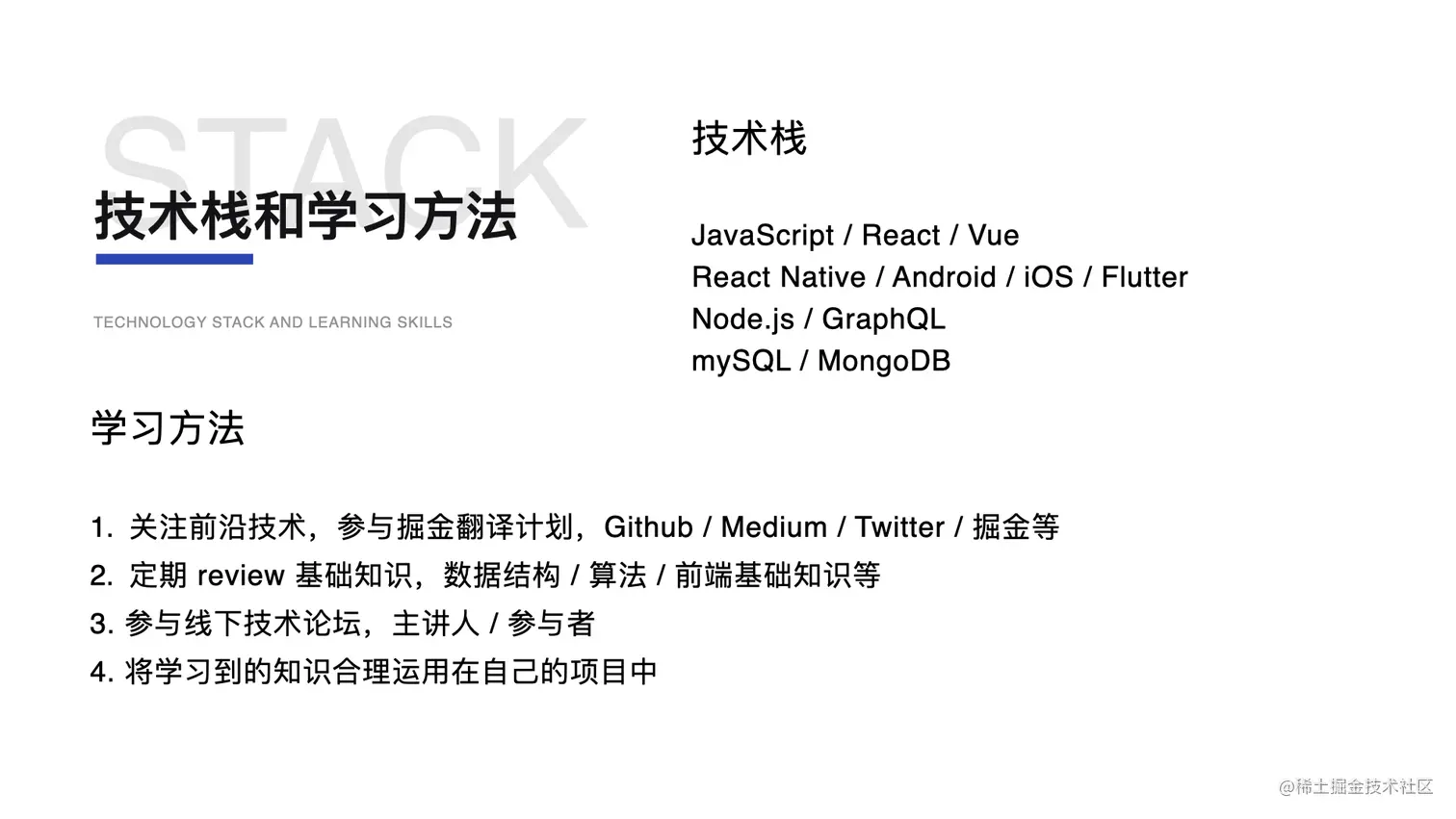 我的技术栈主要是以 React 为主的,跨端技术栈使用的是 React Native,对原生的 iOS 和 Android 开发也有一定的经验。在有数派的时候,使用了全链路的 graphQL 来作为我们的中间层,也做了比较多的 graphQL 社群文化的传播工作。在学习方法上面,除了自己需要去关注一些技术之外,我是比较推荐大家自己做一些沉淀和输出的,因为光靠自己学习,你能了解到的东西其实很少,只有自己沉淀下来,能够反向对我们的社群去进行反哺,才是对自己有真正提升价值的。