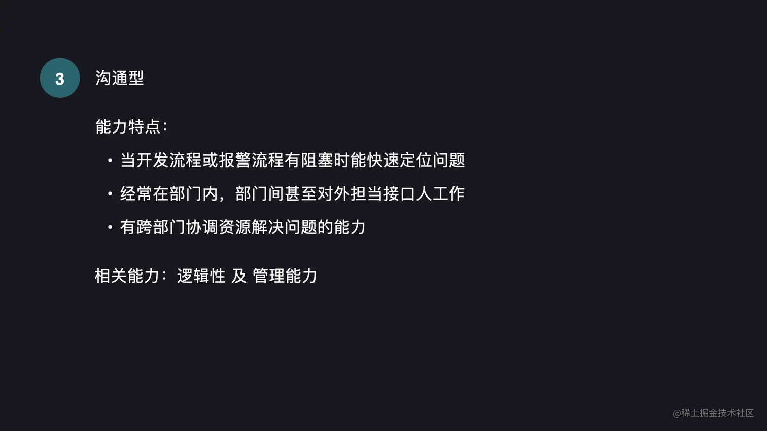 沟通性意味着你在你的开发流程或者报警流程里是一个阻塞的解决者。你能够快速的定位阻塞的原因,同时加以解决。比如今天产生了一个 bug,如何快速的定位问题,同时反馈给对应的同学加以解决。比如产品给出的需求,进度比预期缓慢,是否能够快速的找到原因并加以推进。同时你在部门内或者部门间,甚至是公司对外的接口人,去承担沟通协调组织的工作。你也需要有跨部门去协调资源来解决问题的能力。同时你也需要有一定的逻辑型和管理能力,来辅助你做好相关的工作。