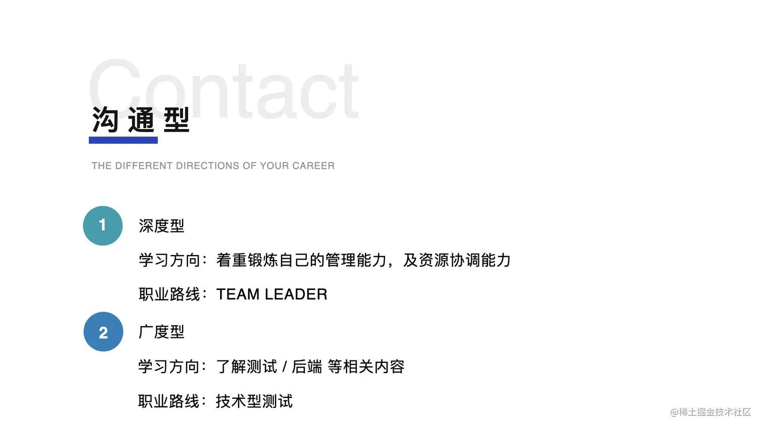 深度型的话,就是转管理岗,但是这个是要有机遇的,不能强求,不是说你想做管理岗就一定会有机会,比如跳槽的时候可能刚进一个公司也不会有机会直接就进行团队的管理,首先还是要学会展现自己的能力,再追求管理经验的一个积累。