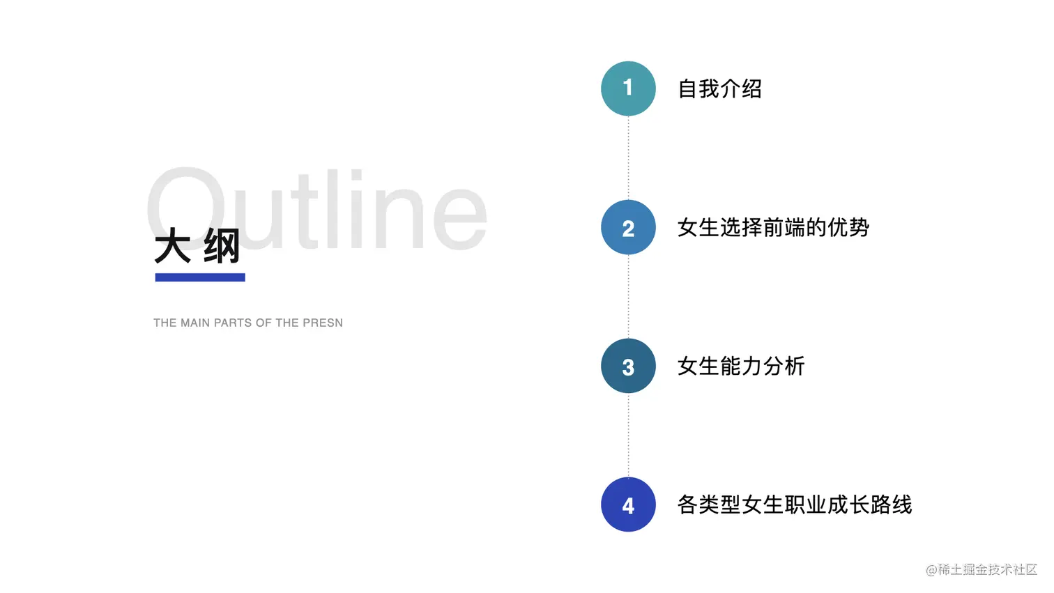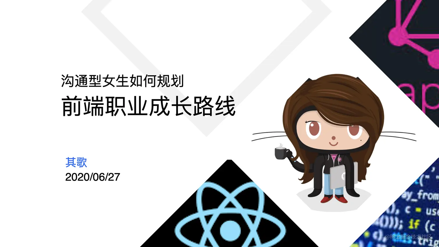 大家好,我是阿里巴巴菜鸟网络的其歌,我今天分享的话题虽然名字叫做「沟通型女生如何规划前端职业成长路线」,但是我会帮助各个类型的女生分析之后的职业发展路线和方向。