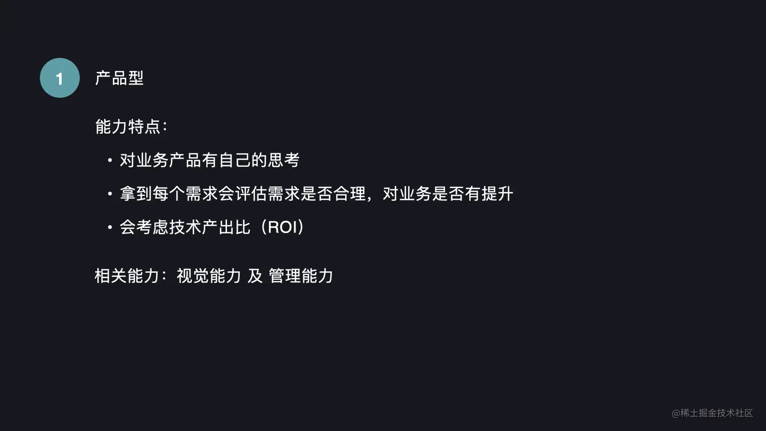 最重要的能力特点就是产品能力。你对自己公司关联的业务产品必须是要有自己的思考的。我在面试同学的时候,经常会遇到一些同学说自己做的事情就是把产品 or 设计产出的 Prd 或者设计稿进行一个视觉和功能上的实现。这种工作是无法把你和别的前端区分开来的。作为一个前端,你是否能够想清楚你区别于别的前端的能力价值在哪里?你的思考就是你的价值。每个需求,前端也需要参与进去评估这个需求是否合理,对业务有什么提升,如果换你来做是否能规划出更好的需求。同时也你需要评估技术产出比(ROI),在同样的时间单位内,我们是否可以把有限的研发资源投入到对业务更有帮助的需求上面去。同时你也需要有一定的视觉和管理能力,去对工作进行一种更高维度的规划。