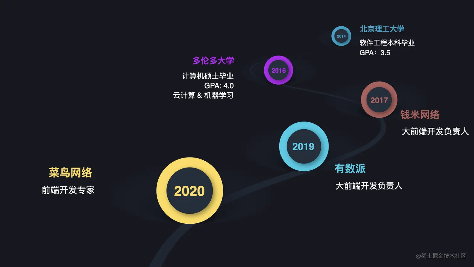 首先是自我介绍,我是 10 年到 14 年在北京理工大学就读于软件工程专业,本科毕业以后放弃了保研资格,去了多伦多大学读计算机硕士,进行了有关云计算和机器学习的学术研究,毕业以后在多伦多工作了大概将近半年的时间后回国。17 年到 19 年都是在一些创业团队担任大前端的开发负责人,负责过 H5 / PC / 跨端等多端产品的研发,累积了比较多的从 0 到 1 的经验。在做工业 4.0 的公司有数派积累了大量物联网和 To B 类业务的经验。20 年初加入了菜鸟网络,担任前端开发专家一职。