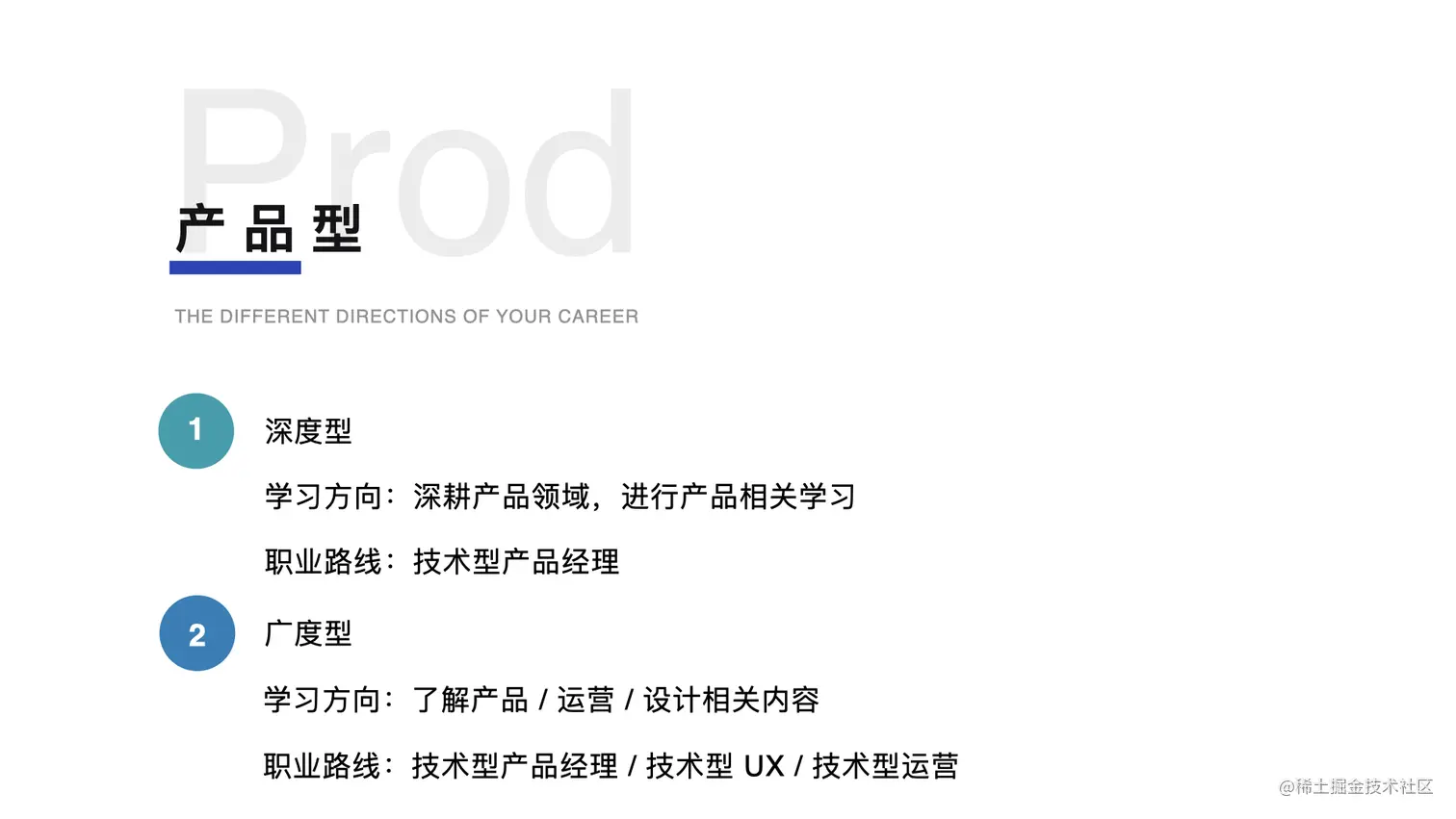 广度型的话,还需要去了解一下 UX 和运营相关的知识,你不光可以做产品,也可以去做 UX 和运营。这些工作都是非常考验你综合能力,也是可以把你的优势发挥到极致的。同样你的技术背景也会让你更具竞争力。