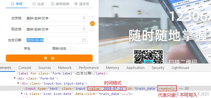 js = "document.getElementById('train_date').removeAttribute('readonly')" # 编写 JavaScript 语句移除 readonly 属性