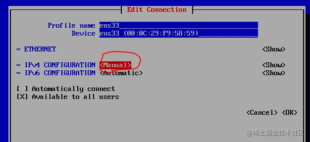 选择ens33网卡(或者是其它网卡) 将原先的automatic改为manual 选择右边show并回车