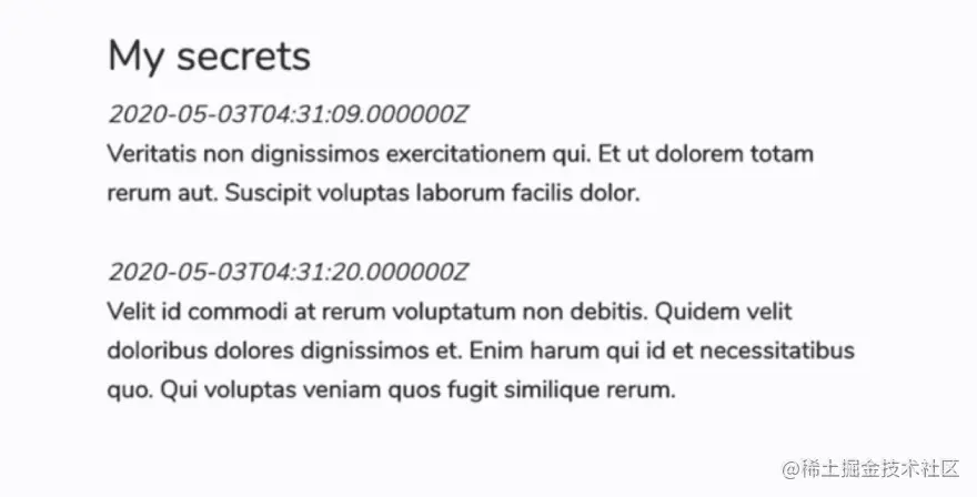 我们需要做的第一件事是创建一个可以从中获取数据的 API 接口。我构思了一个超级简单的应用,用于检索展示每个用户的秘密列表。