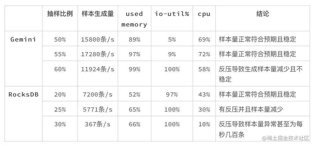 由以上对比可以看出,在数据、作业处理逻辑、硬件配置等都相同的前提下,使用 Gemini 成功处理的数据量是 RocksDB 的 2.4 倍(17280 vs 7200 条/s)。同时通过硬件资源消耗的对比可知,RocksDB 更快达到磁盘 IO 瓶颈,而 Gemini 则具备更高的内存和 CPU 利用率。
