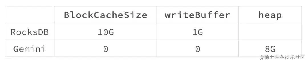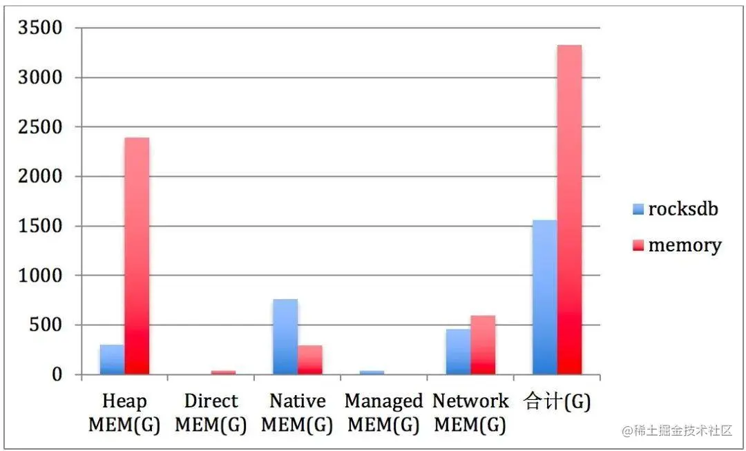 - 使用 RocksDB 则需要较少的 Heap 空间即可,加大 Native 区域用于读缓存,结合 RocksDB 的高效磁盘读写策略仍然有很好的性能表现。