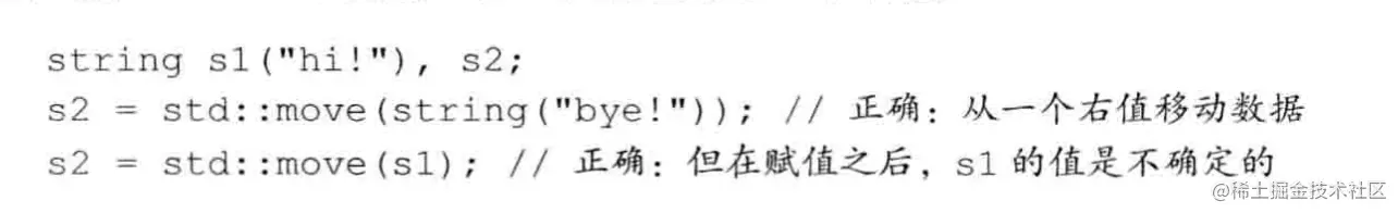 2. 希望将一个右值引用绑定到左值上可以调用std:move()方法,但是调用后之前的左值会发生所有权转移,因此不能再使用下面的图片抄自c++ primer