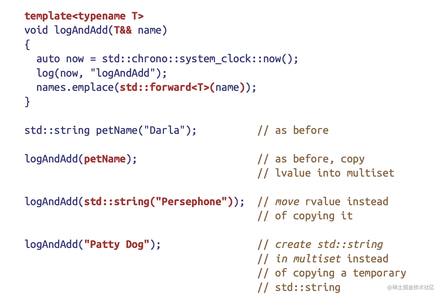 push_back函数的参数当然有资格成为一个通用引用,然而,在这里并没有发生类型推导。 因为push_back在一个特有(particular)的vector实例化(instantiation)之前不可能存在,而实例化vector时的类型已经决定了push_back的声明。也就是说,