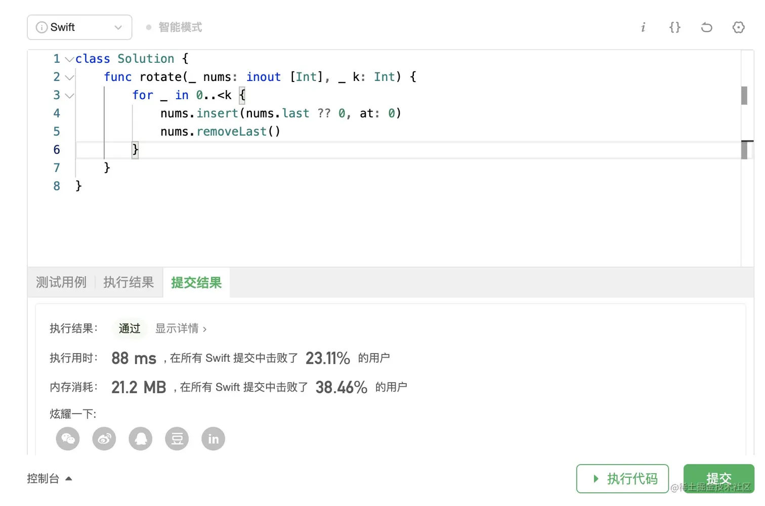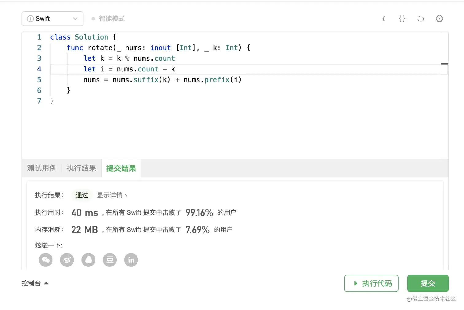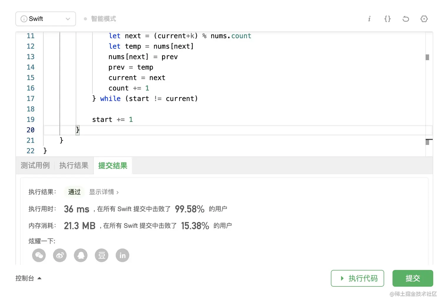 思来想去,找不到更好的答案找到去看了官方的解答,他们用了 环形替换 很巧妙的方法,我看到之后只觉得,人家的才叫算法,自己写的那就大力出奇迹(我看了半天才看懂)。翻译成swift如下