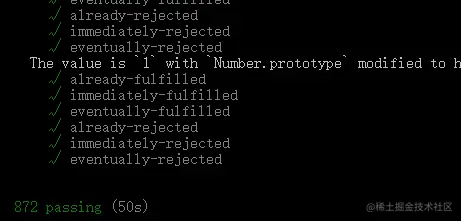 我们只需将上面函数放入已实现代码并且将代码中的setTimeout替换为nextTick就可以了。当然测试也是通过的,但这是Node环境下的测试,必然使用的是上面nextTick函数中process.nextTick生成的微任务,至于浏览器下的测试我就不得而知了。