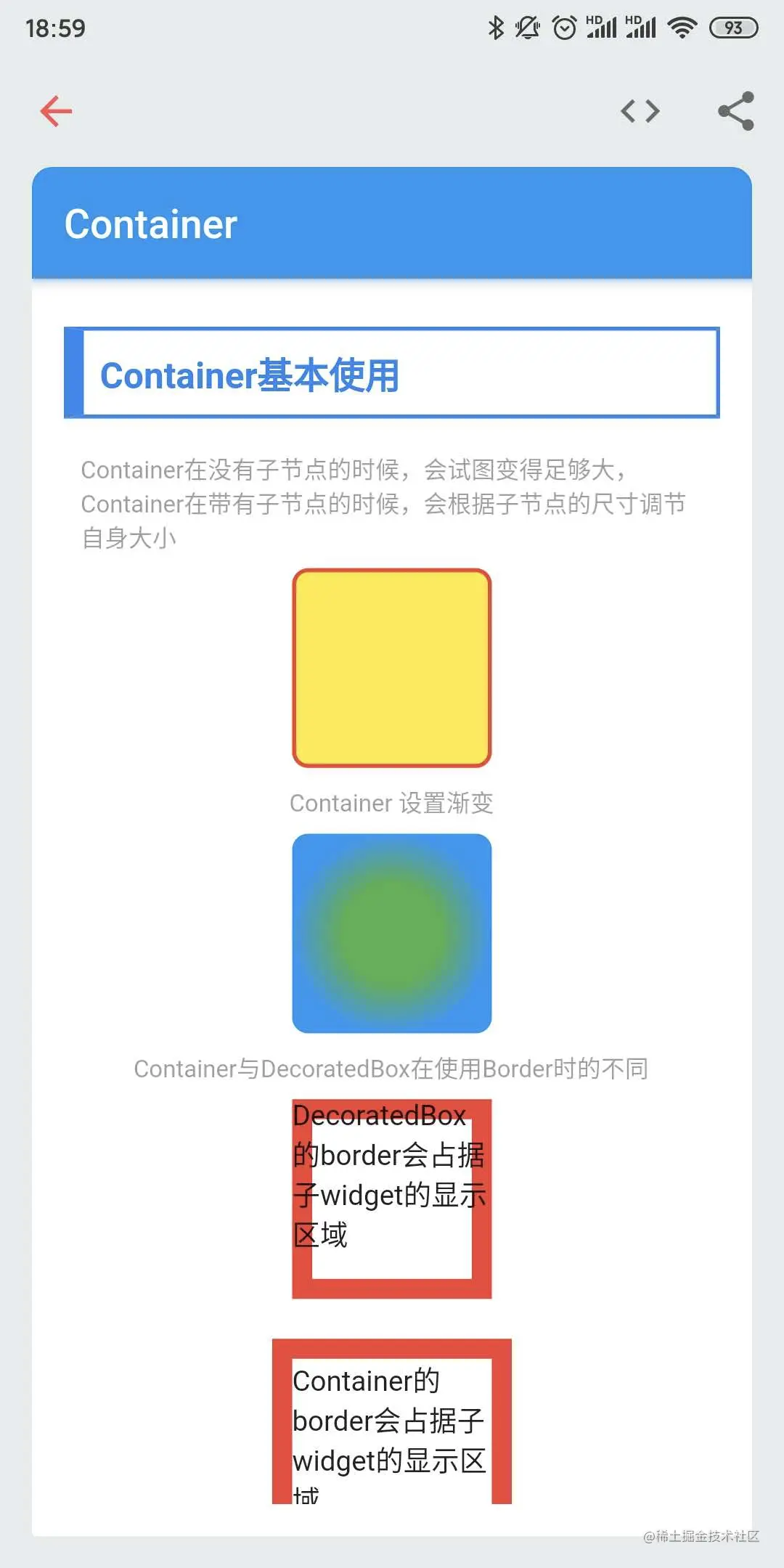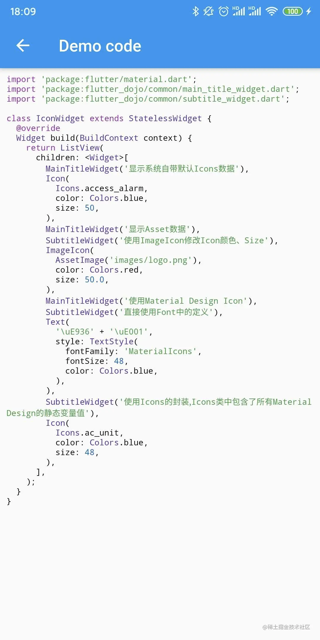 在官方的Demo,Flutter Gallery中,有类似的实现,这里实际上是借助Markdown的解析,将代码展示出来,如图所示。