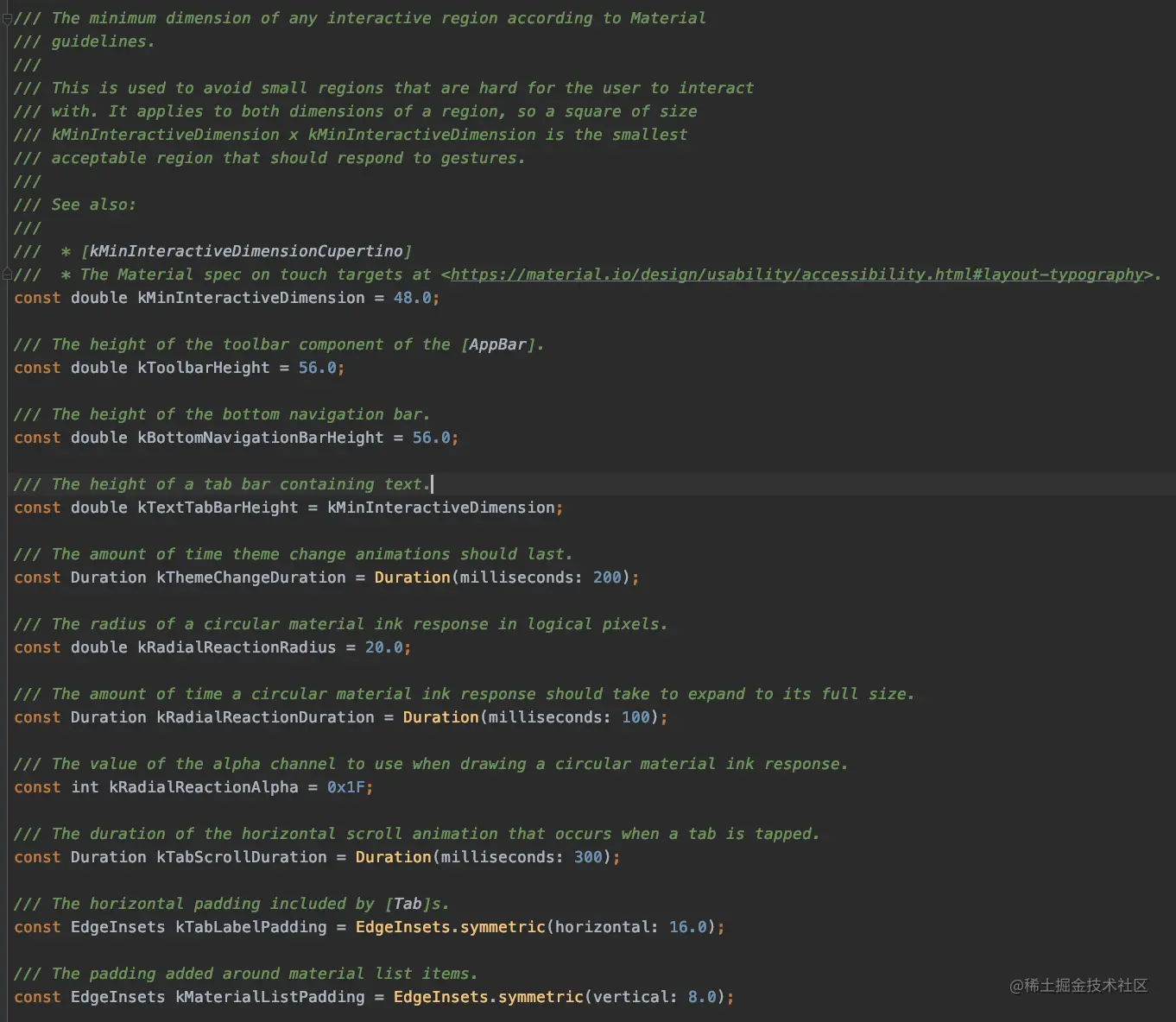 其实就是屏幕高度减去Topbar、Bottombar等Widget的高度,除此之外,Flutter SDK还很贴心的封装了一些常量,例如Topbar的高度这样的,以【k】开头,如下所示。