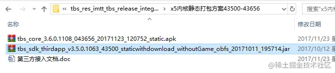 下载后,只需要提取里面的tbs_sdk_thirdapp_v3.5.0.1063_43500_staticwithdownload_withoutGame_obfs_20171011_195714.jar,另外一个apk文件是内核(这个内核太老,就不要了)。