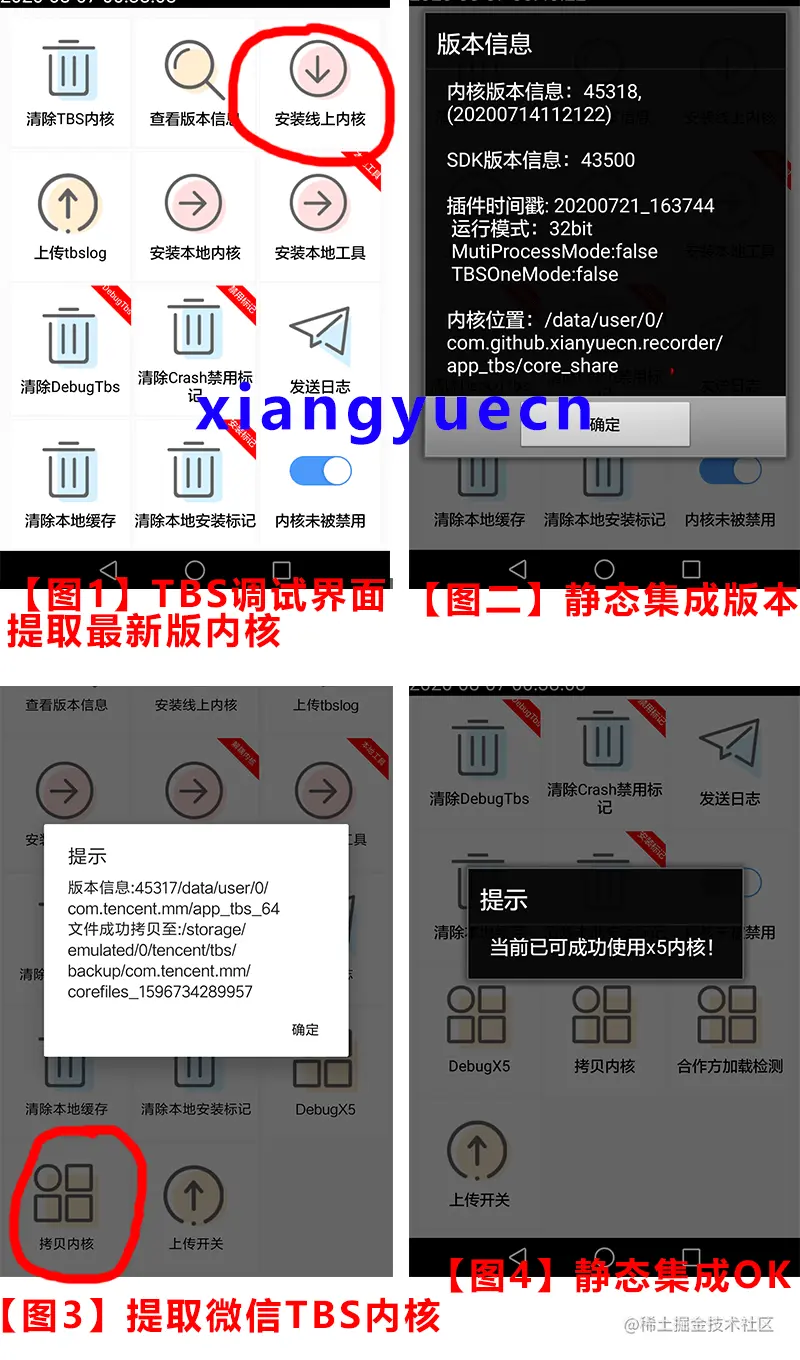 X5内核(如果下载不了,尝试改回新版本SDK下载,然后再改回来)。点击安装线上内核(参考顶上【图1】),它会自动识别App的架构,下载到armeabi或者arm64-v8a架构的TBS内核包,下载完后重启App就可以进行内核提取操作了。