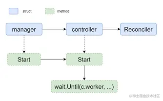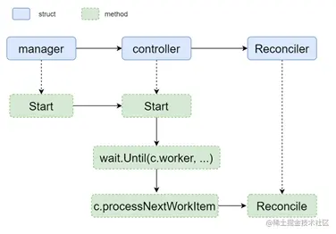 // manager -> controller -> reconciler 的对象层级结构