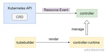 3)controller-runtime controller-runtime被用来创建K8s资源控制器,如果引入了CRD的话,单纯定义这个资源只能起到存数据的作用,并没有业务处理逻辑。通过controller-runtime可以监听资源的变化,捕获Resource Event,触发相应的处理流程,让这个自定义资源表现出和原生资源相同的行为。