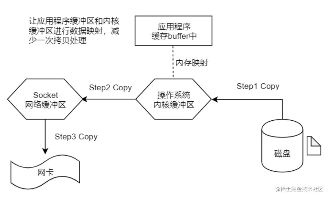 在操作系统内核缓冲区和Socket网络缓冲区之间建立管道,来减少拷贝次数。