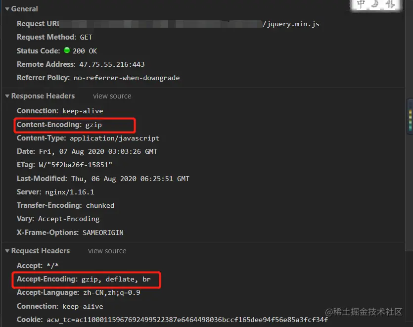 响应头里Content-Encoding: gzip表示响应的资源时gzip的,告诉浏览器需要解压