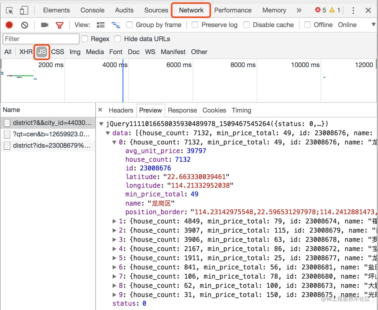 因为第一层,第二层的数据没有那么多,这两个接口都是把所有的数据一次返回给前端。但是第三层的数据量就非常的巨大了,链家采取的是返回部分数据,将前端页面上显示的最大经纬度以及最小经纬度传给后台,后台再将筛选后的数据返回给前端。(接口地址大家可以使用 Chrome 的开发工具进行抓包,这里需要注意的是链家的接口采用 jsonp 的形式,所以需要抓取 JS)