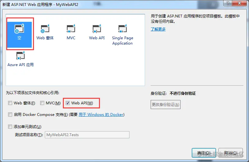 上篇博客介绍了手动搭建基本框架,这次我们通过VS2017提供的模板,新建空的WebAPI应用程序MyWebAPI2,构建过程中仅勾选Web API,如下图所示。