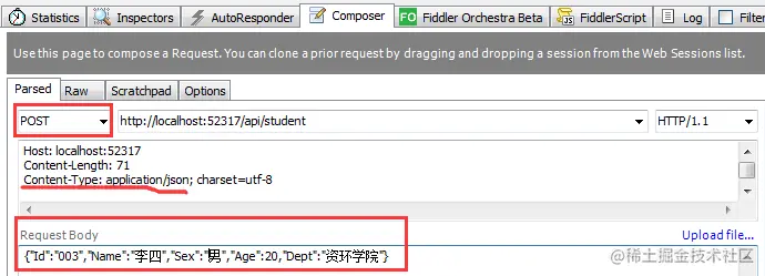 URL:**http://localhost:52317/api/student**;HTTP方法:**POST**。在RequestBody输入Json格式的数据,如下图所示: