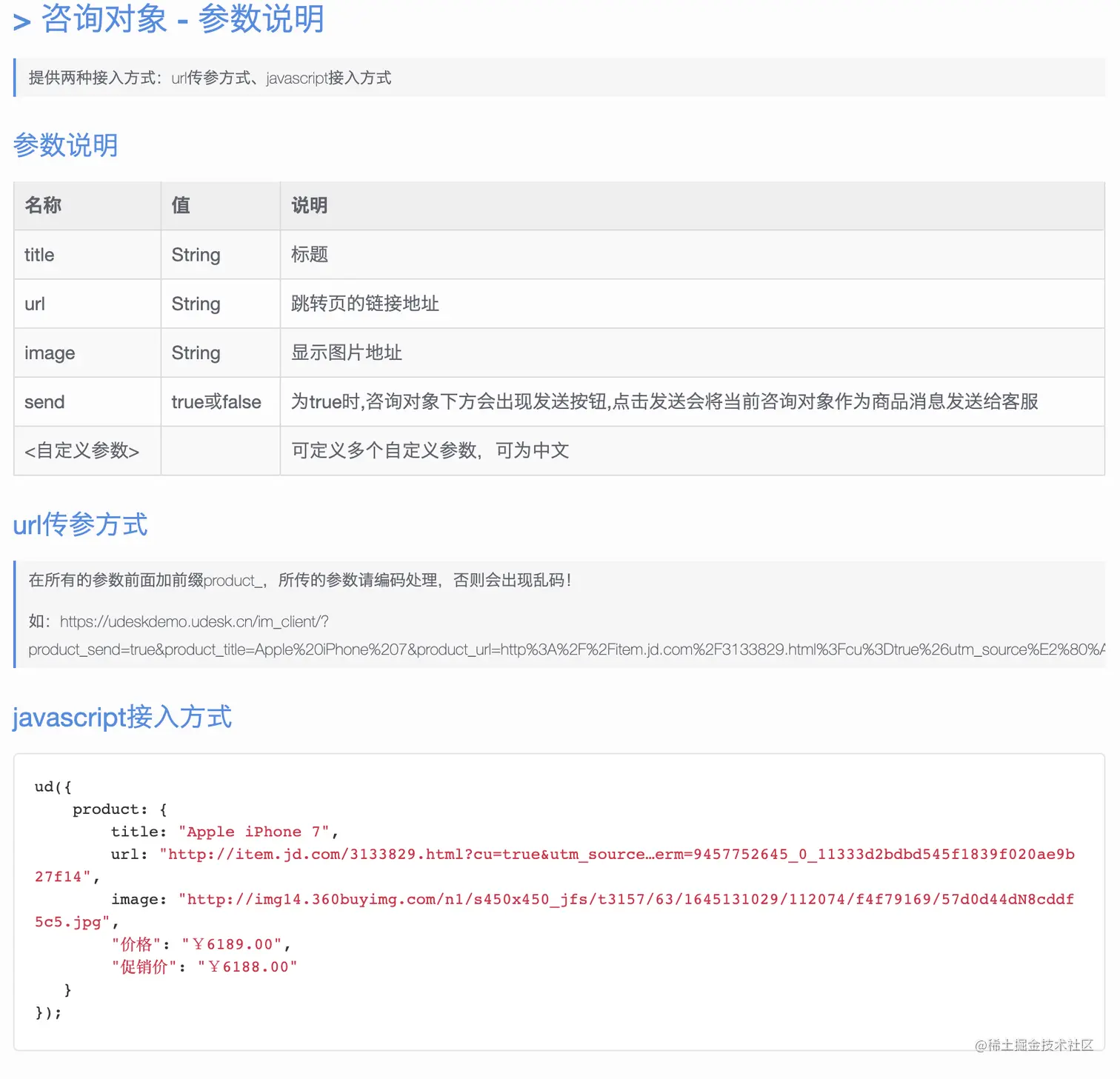 但是使用下来,javascript 接入的方式动态传入参数,Udesk 后台根本捕获不到商品信息,只有写死为字符串的时候才可以,具体原因未知。