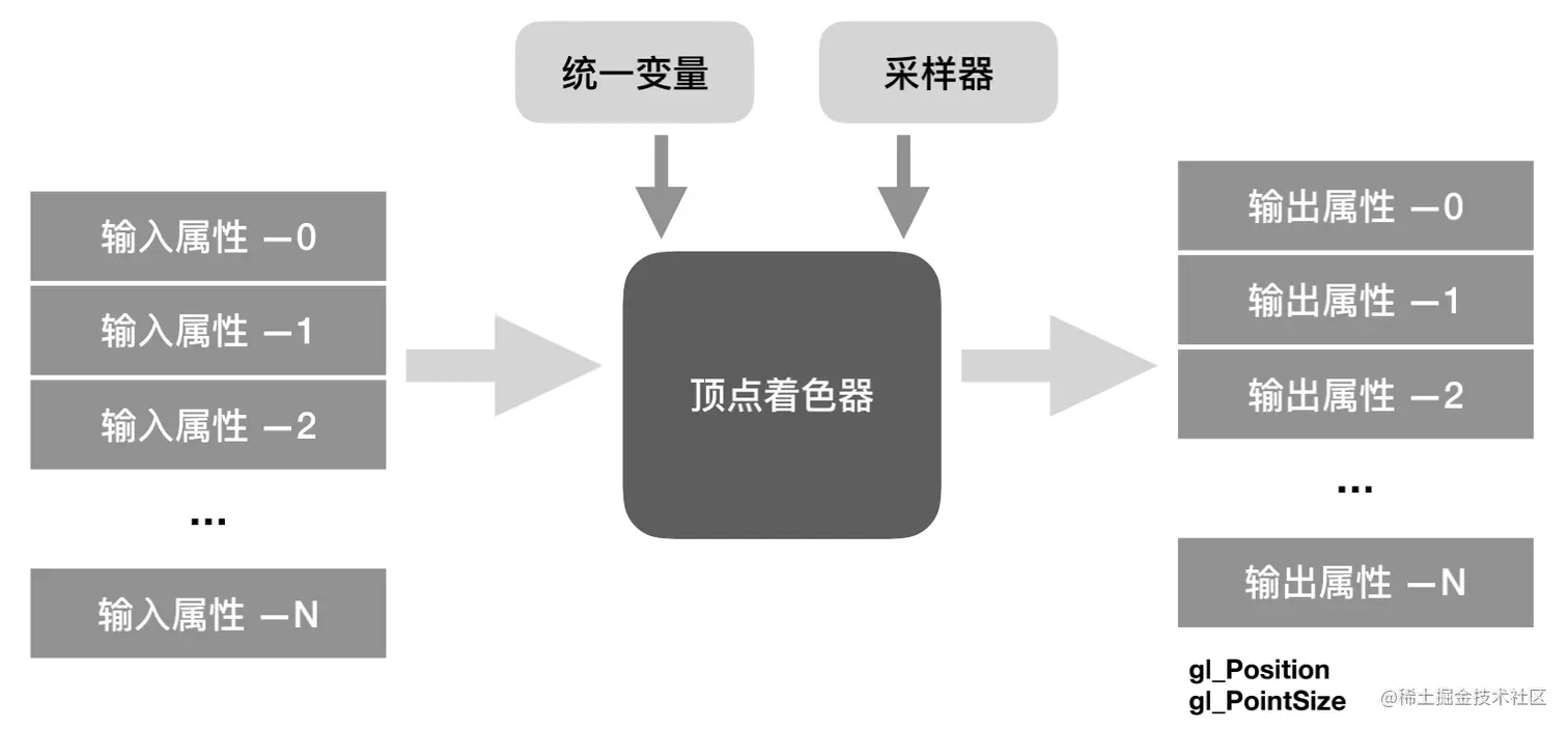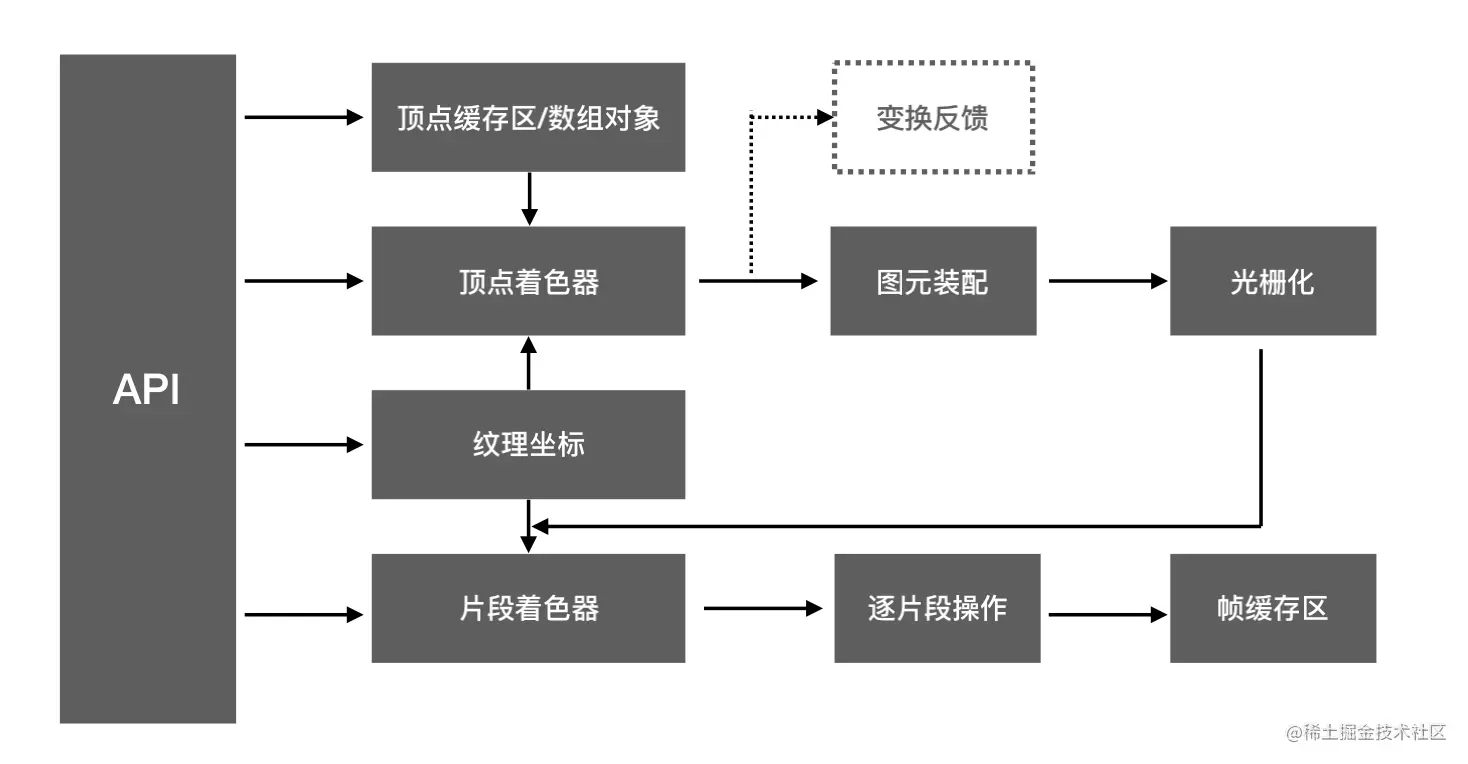 从OpenGL ES 2.x开始,OpenGL ES支持可编程图形管线。当然整个管线流程中大部分组件的处理流程也还是GPU内部固定的,也是通过CPU层传入输入数据和参数到各个部件中,只有 Vertex Shader(顶点着色器)和 Fragment Shader(片元着色器)是可编程的。
