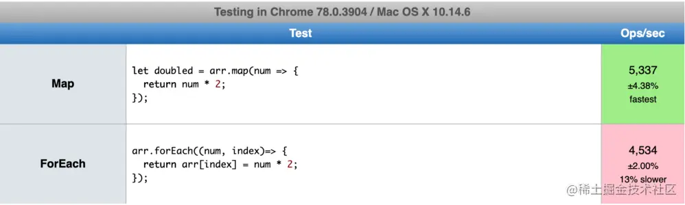 有些帖子提到 map 比 forEach 快。所以,我很好奇这是不是真的。我找到了这个对比结果。