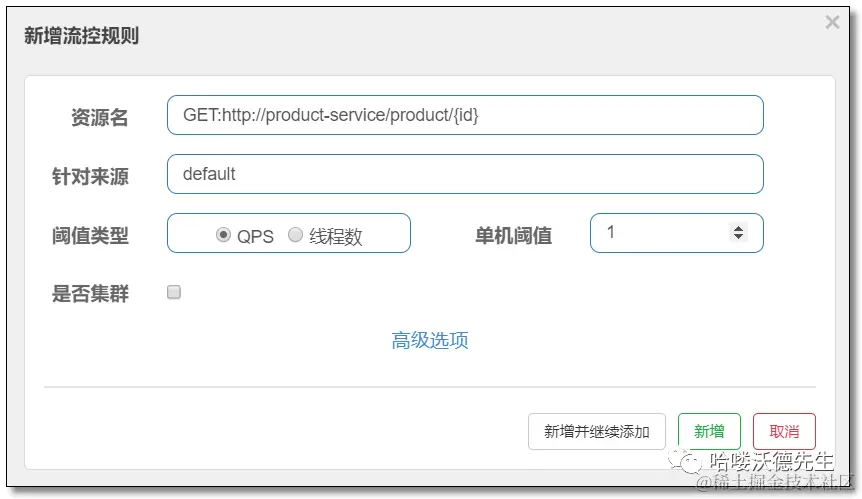 添加流量控制规则,定义资源访问的 QPS 为 1(每秒能处理查询数目)。