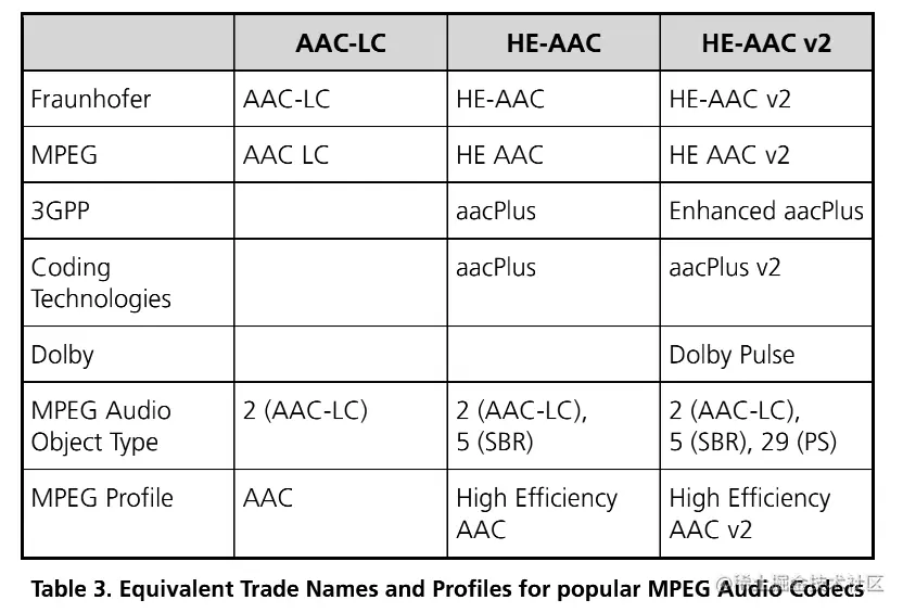 一些公司在其AAC的实现中使用了商标名称,如表3所示。所有名称都引用相同的MPEG编解码器,并且可以互操作。 HE-AAC在内部是SBR(频谱带复制)和AAC-LC音频对象类型的组合,而HE ACC v2是这两者与PS(参数立体声)音频对象类型的组合。
