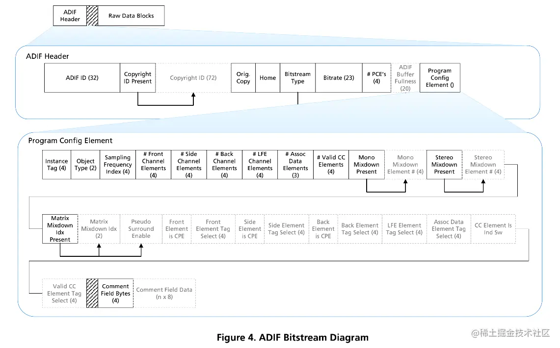 为了帮助理解ADTS,ADIF和LATM / LOAS格式的结构,下面给出了显示其基本结构的图表。 此简化的介绍不包括MPEG-4标准中定义的格式的所有详细信息或特殊情况。