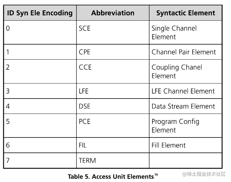 访问单元可能还包含PCE元素(请参阅AudioSpecificConfig()结构),填充元素(FIL)(用于填充比特流,以保持瞬时比特率)以及数据流元素(DSE),用于用户数据和特定于DVB的元数据。 FIL元素被AAC-LC解码器丢弃,还用于包含HE-AAC解码器使用的SBR数据,用于响度归一化和动态范围控制的元数据,以及用于MPEG Surround编码的隐藏空间位流