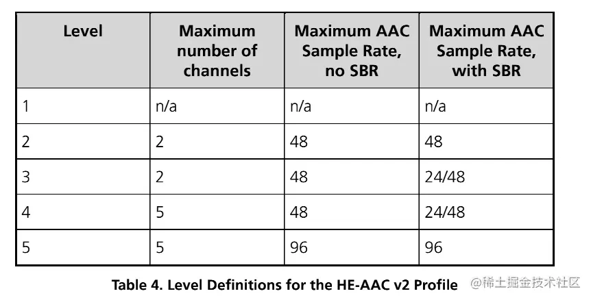最后,许多配置文件包括级别定义以指定解码器的最大性能。 表4中显示了一个用于HE-AAC v2的级别。级别定义可能具有复杂的限制,如表中级别3和4的24/48条目所指出的。要理解这一点,必须详细参考标准12。