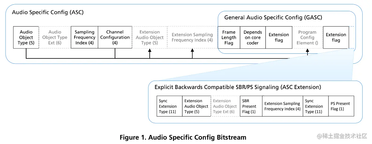 ASC没有定义为固定字段结构,而是通过伪代码描述。 ASC由两部分组成,通用部分包含大多数MPEG-4音频对象类型所共有的信息,第二部分包含特定于音频对象类型的信息(例如帧长)。 对于AAC-LC和HE-AAC,第二部分在标准中称为GASpecificConfig。
