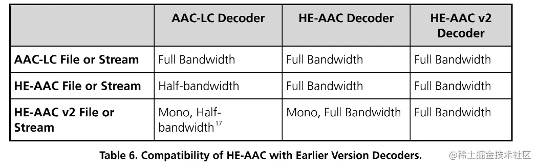 对原始AAC标准(例如HE-AAC)的扩展被设计为以兼容的方式进行传输,因此较早的解码器将忽略额外的比特流元素。 当在仅支持该标准较早版本的解码器上播放HE AAC流或文件时,由于不支持SBR,由HE-AAC中的SBR技术再现的信号的最高八度会丢失。 当在HE-AAC或AAC-LC解码器上播放HE-AAC v2流或文件时,由于立体声图像是通过HE-AAC v2中的Parametric Stereo技术再现的,因此该信号以单声道形式再现。 如下表所示: