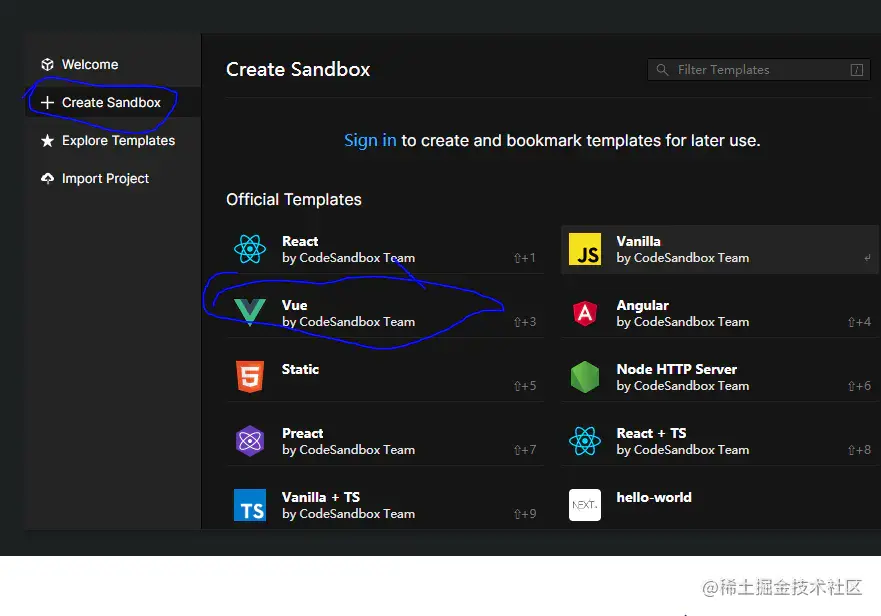 点击进入代码沙盒官网,(建议新手不登陆,登录后只能使用50次),不登陆可以一直使用,点击Create Sanbox,再选择vue,即可创建vue项目。
