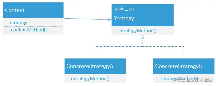 - ConcreteStrategy(具体策略):包装了相关得算法或行为。