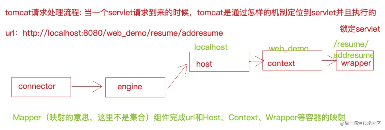 Tomcat维护了一个Mapper组件,在Mapper组件里封装了url和Servlet的映射关系。