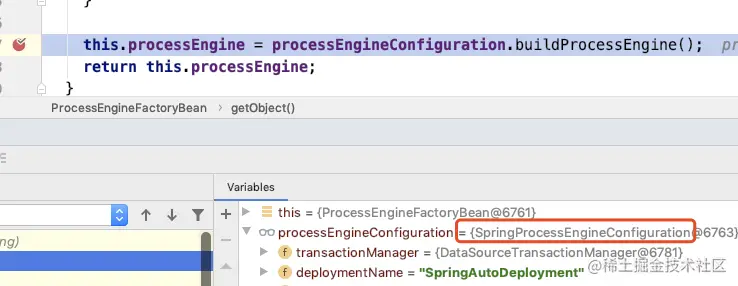 断点看到是用了 SpringProcessEngineConfiguration 这个实现类 ,那就跟着断点进到这个方法里