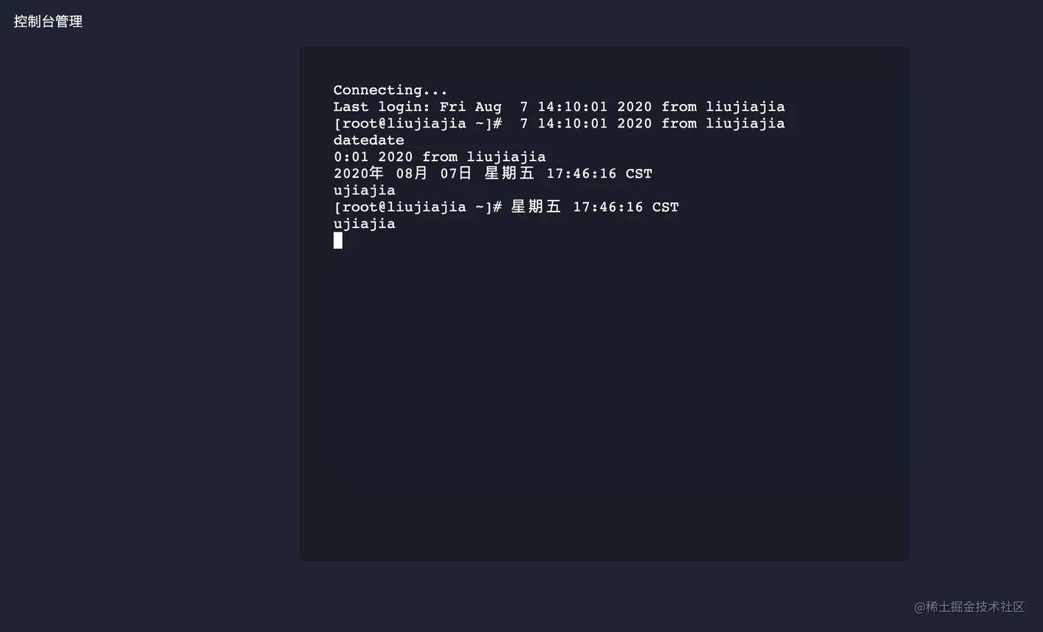 前端和后端的通信,使用的是WebSocket,后端连接服务器,我只负责前端部分,所以这里只列前端的方法。页面显示出控制台这个操作页面,使用的是xterm.js。整个工作流程就是:前端在xterm.js里面输入文字,通过socket和后端通信,后端把前端传过来的命令,通过ssh连接服务器,得到服务器返回的数据,通过socket传给前端,前端再显示出socket返回的内容。