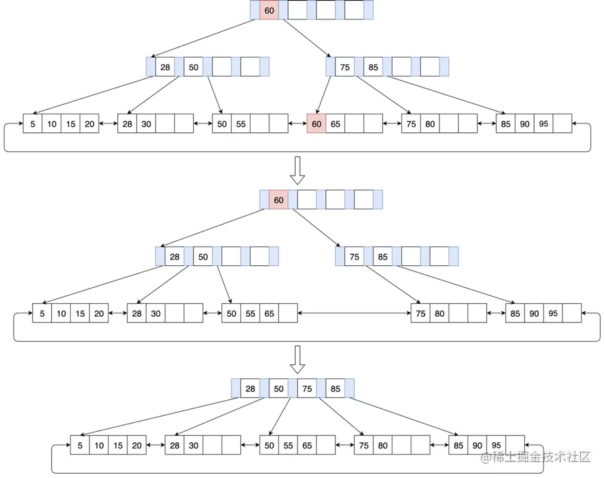 此时要删除60这个键值,60删除后,所在的 Index Page 和 Leaf Page的填充因子都小于50%,此时就是需要如下操作: